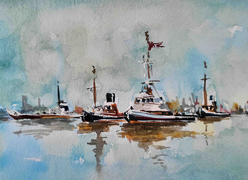Power, patience, and a touch of nostalgia — this original watercolour painting, “Tug Boats,” captures the quiet strength of these working vessels in calm harbour waters. Painted by internationally collected artist Edswatercolours, it’s full of movement, atmosphere, and maritime soul.