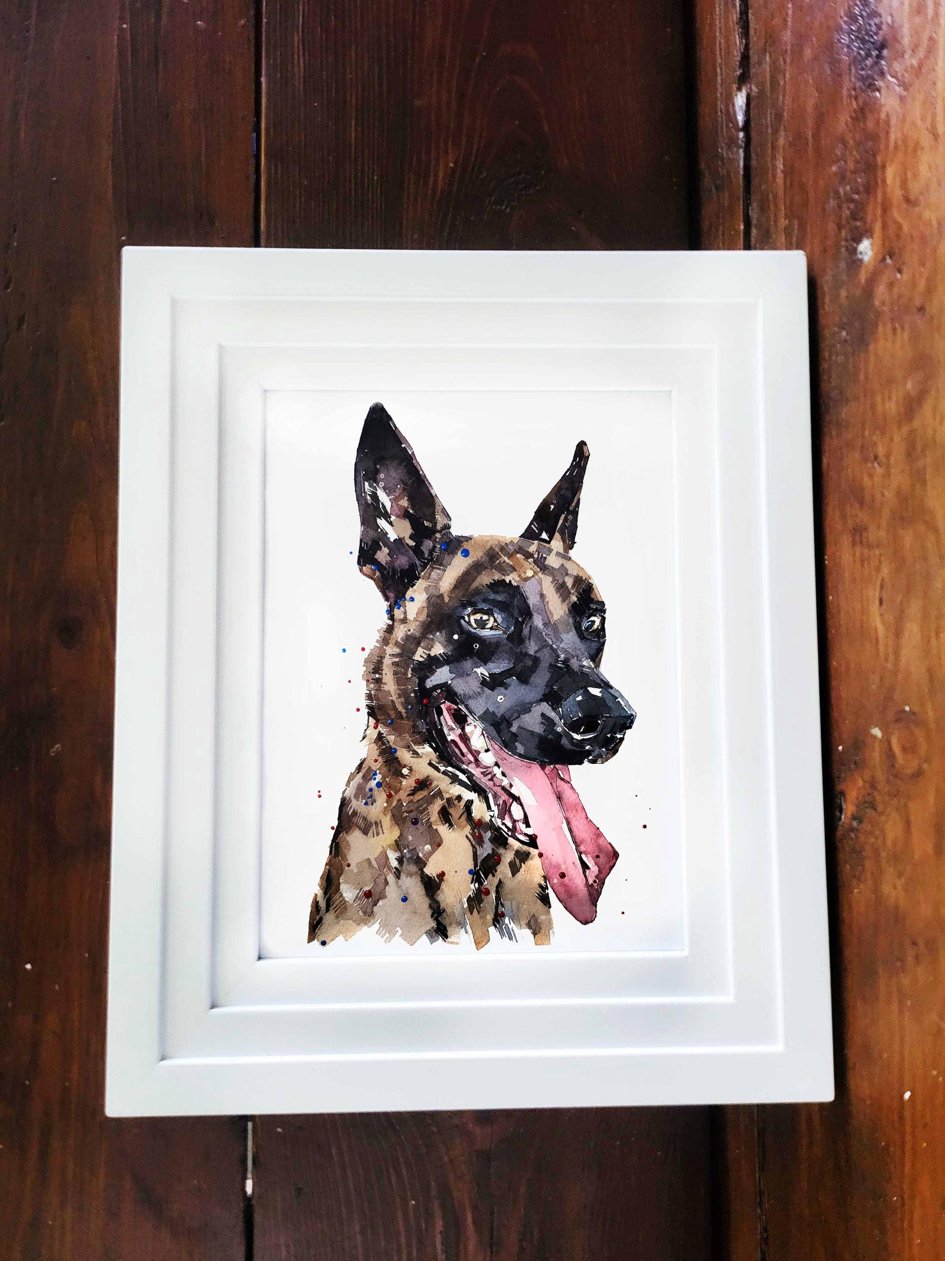 Celebrate the intelligence and loyal spirit of the Dutch Shepherd with this 17x12cm mini art print, beautifully framed in a white rustic wooden frame. Painted by international artist Edswatercolours, this striking piece captures the alert expression and quiet strength of one of the world’s most respected working dogs.